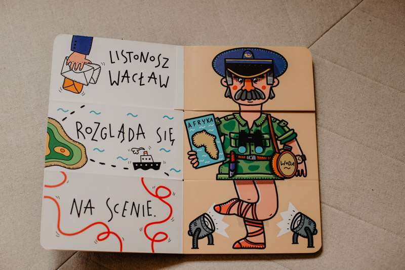 Z tą książką nie dopadnie Was nuda! Co by było gdyby listonosz, spróbował baletu, a ogrodniczka zagrała na elektrycznej gitarze? Tutaj wszystko jest możliwe. Zabawna książka wydana w oryginalnej formie przekładanych stron, składających się z 3 części, dzięki którym każdy z bohaterów może spróbować każdej profesji wbrew utartym schematom. Uwielbiam!