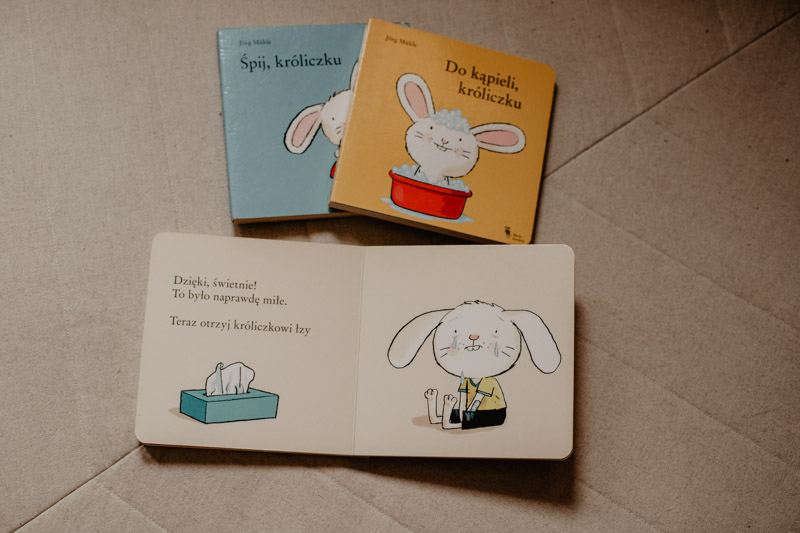 Urocze przygody króliczka. Książka zawiera proste zdania idealne dla najmłodszych czytelniczek i czytelników. Zawierają polecania dzięki którym dzieci są angażowane do wykonywania czynności np. przykrywanie kołderką króliczka, gaszenie światła, czy drapanie króliczka po plecach.