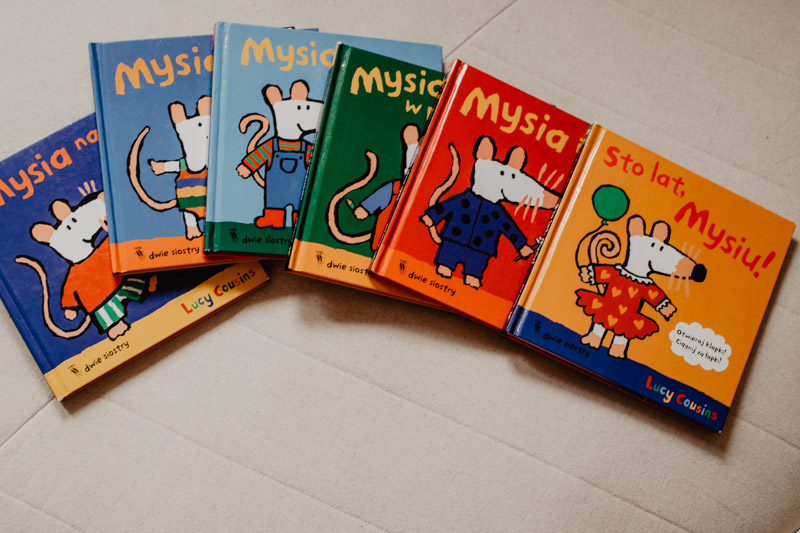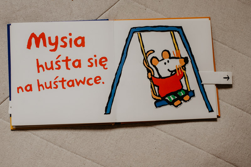 Seria książeczek o myszce Mysi. Każda z książeczek podzielona jest tematycznie. Dzieci uwielbiają ruchome elementy książeczki, które poruszają się po pociągnięciu za łapki lub przesunięciu palcami.